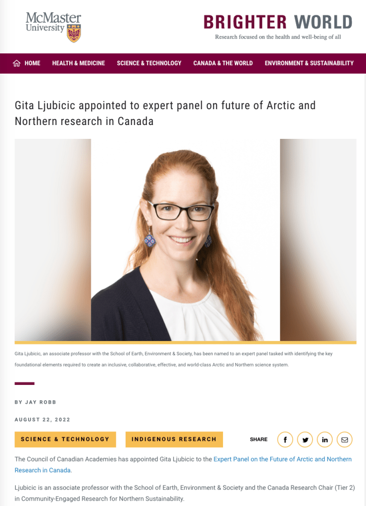 “Gita Ljubicic, an associate professor with the School of Earth, Environment & Society, has been named to an expert panel tasked with identifying the key foundational elements required to create an inclusive, collaborative, effective, and world-class Arctic and Northern science system…