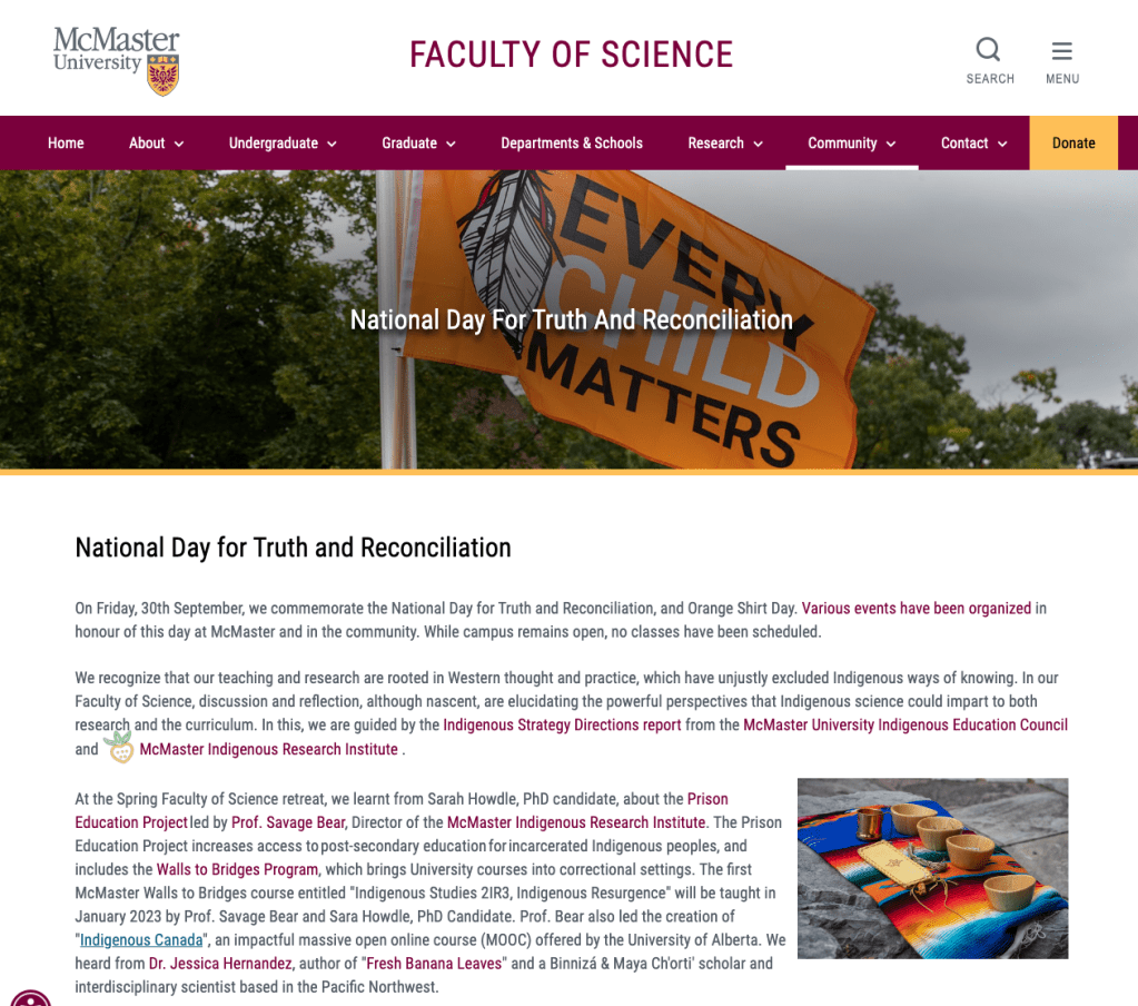 Sharing a reflection prepared for McMaster Faculty of Science, as an invited feature for the National Day of Truth and Reconciliation