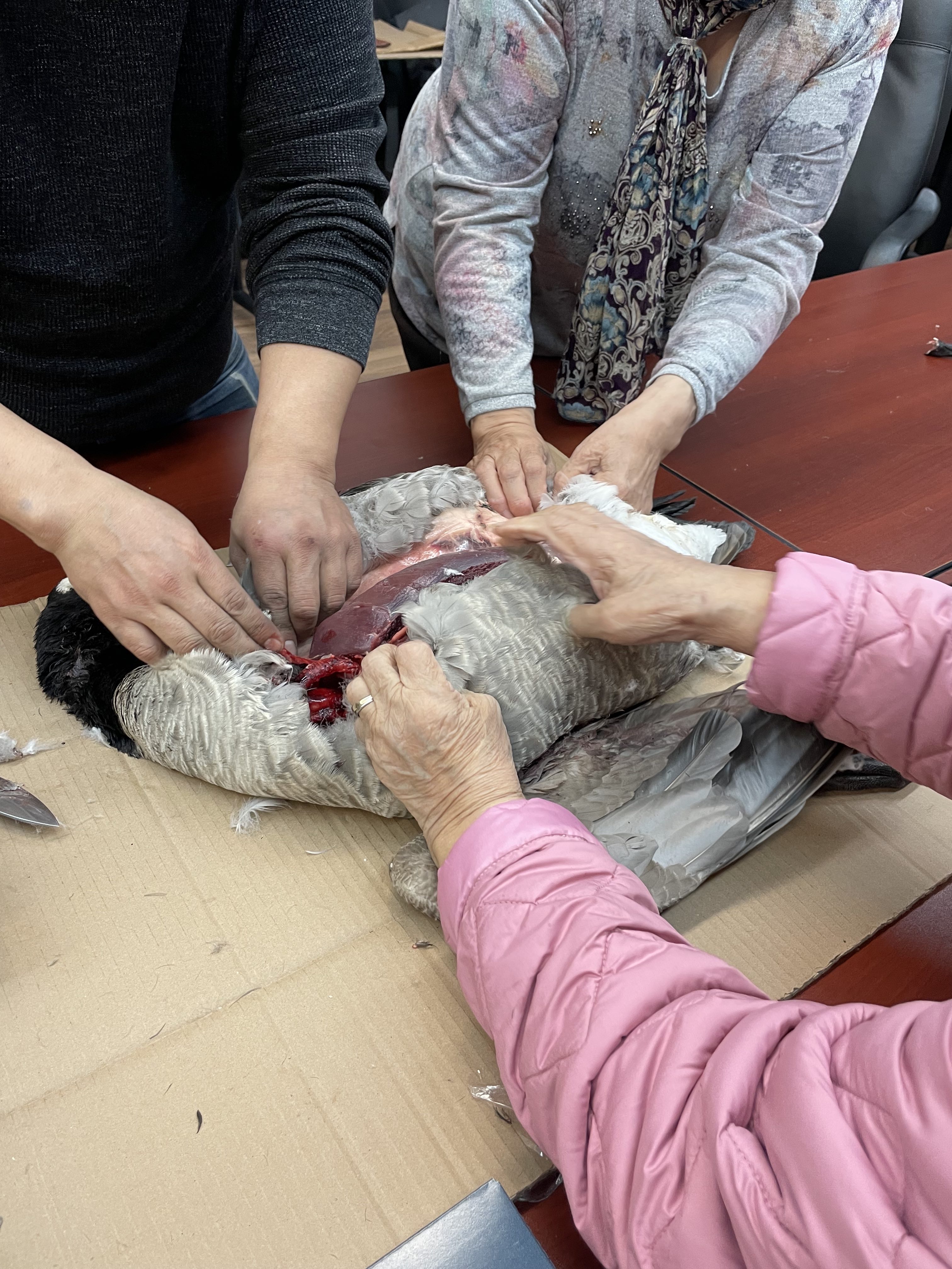 During a goose dissection, Elders engaged in a hands-on approach to discussing internal and external goose anatomy. This was a fantastic learning opportunity because it was much easier to discuss specific terminology when looking at and handling a goose. It was also enjoyable to share a meal of cooked goose afterwards, and it became a running joke as workshop members realized that the dissected goose was eaten before the reproductive system could be examined!