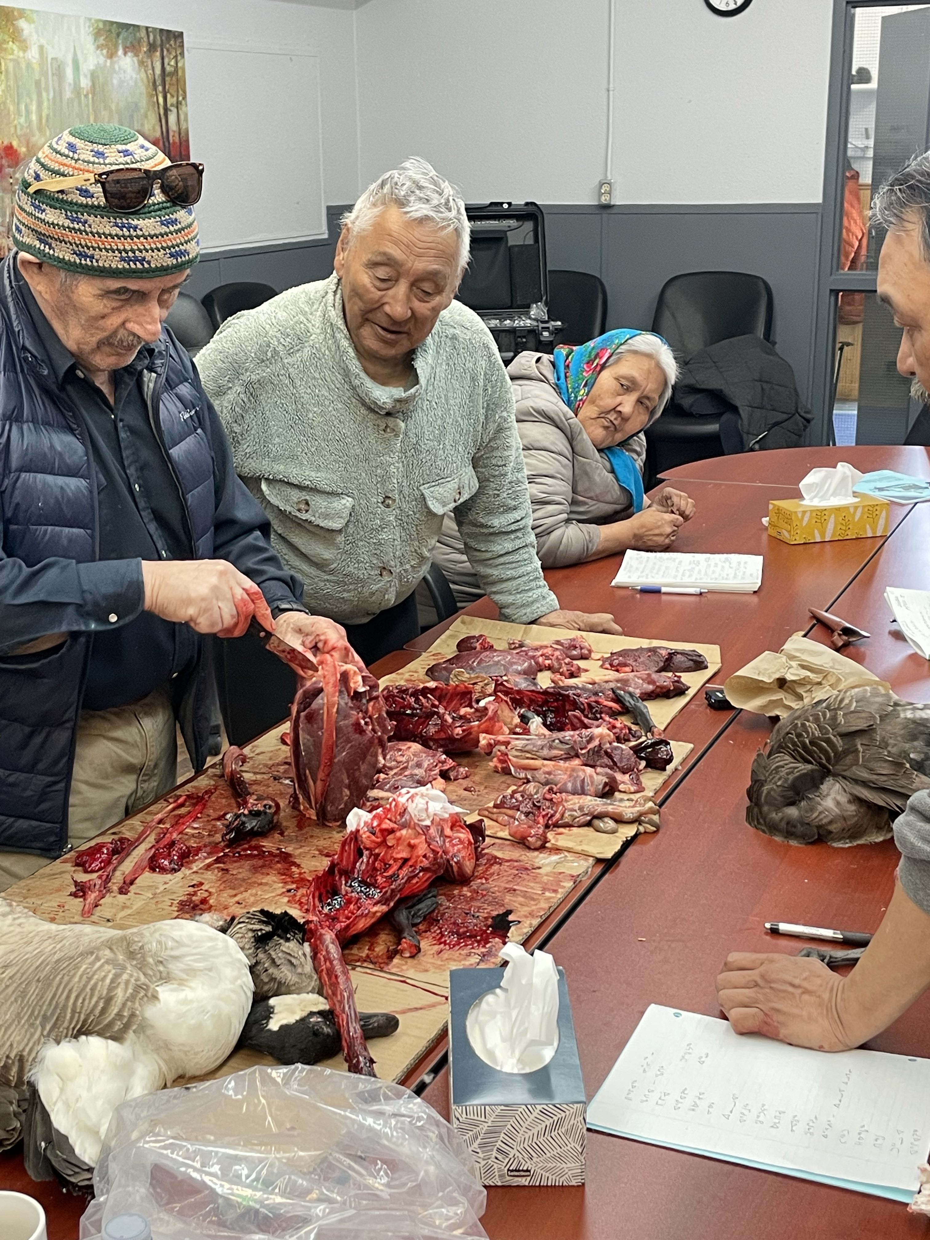 The week continued with more discussion on goose habitat, uses, and diet. We explored egg development and the molting process of geese, terms for different goose species, their fat composition, and habitat preferences. Scientific terms such as contaminants, pathogens, disease, and viruses were discussed in detail with the objective of determining what is important for community members to know and understand. Dialect differences were also highlighted during discussions with several Elders originating from outside of Arviat (Coral Harbour) to consider how to incorporate different terms.