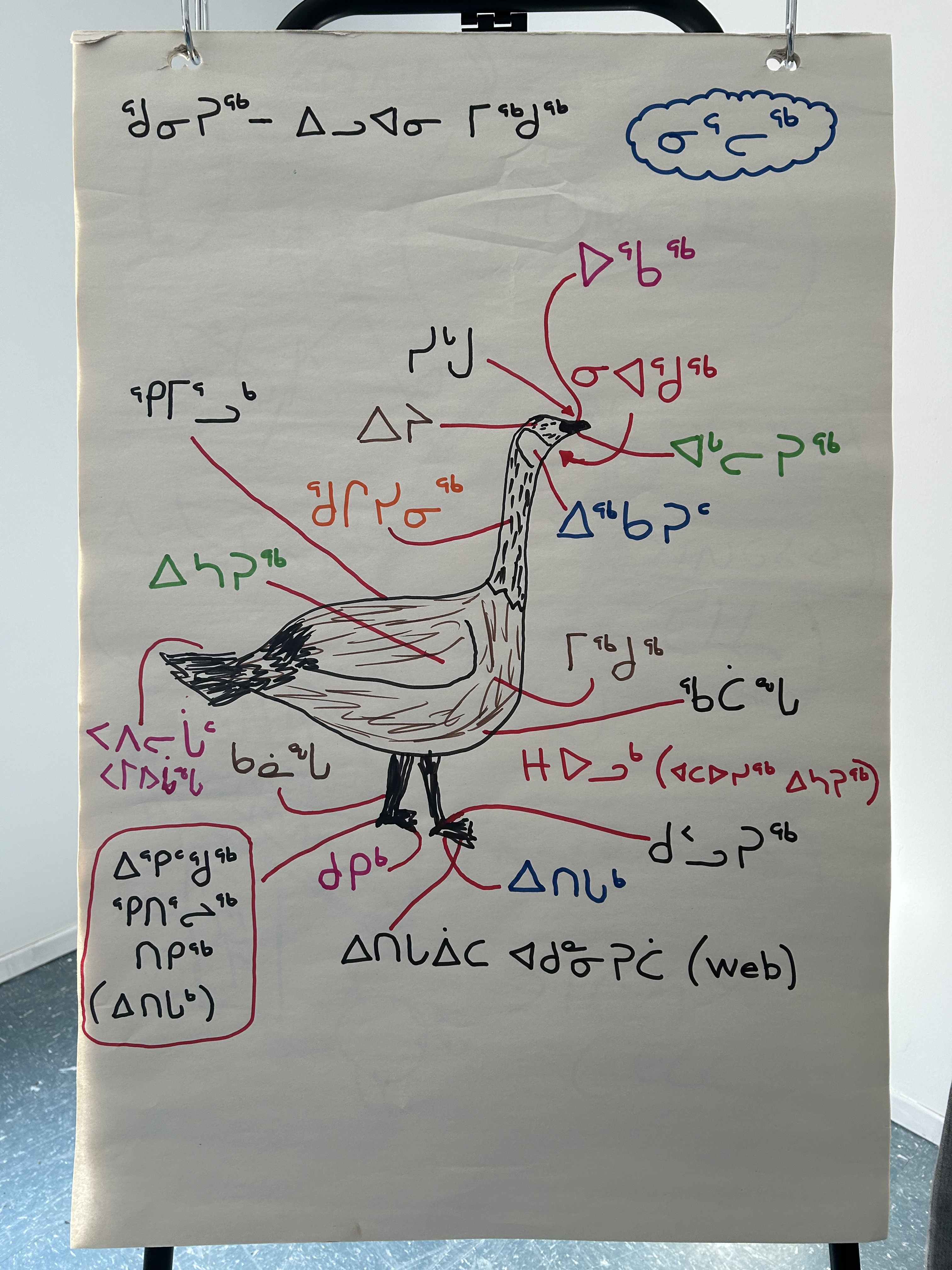 Rowan joined Joe, and Elders Andrew Panigoniak, Lisa Gibbons, Mike Gibbons (Tunaala), Linda Kaviok, Dorothy Aglukark, David Alagalak, Arden Nibgoarsi, and Gordon Okoktok for a weeklong goose terminology workshop. Throughout the week, Elders discussed and identified specialize Inuktitut terminology associated with goose anatomy, traditional uses of geese, and goose habitat.