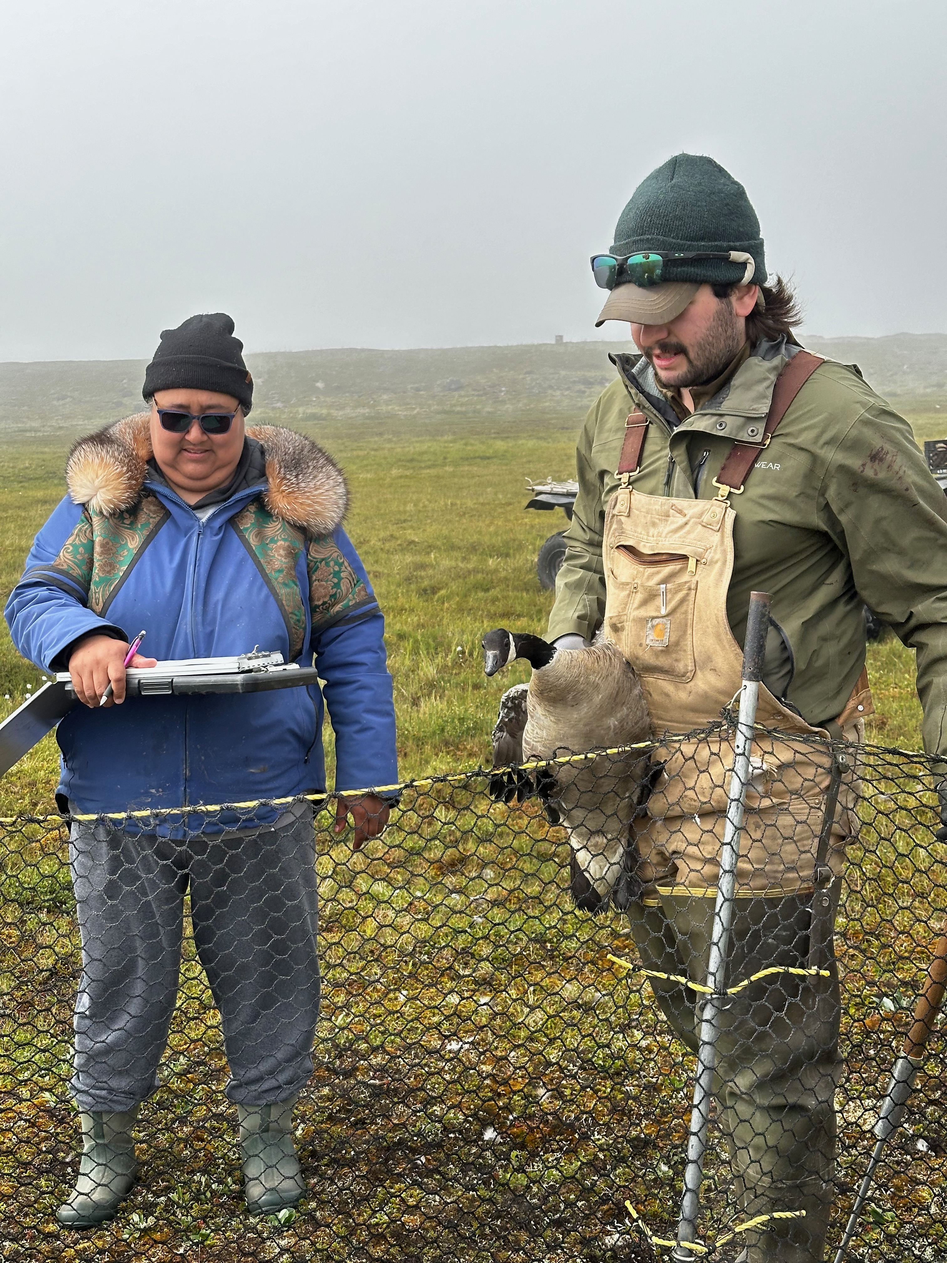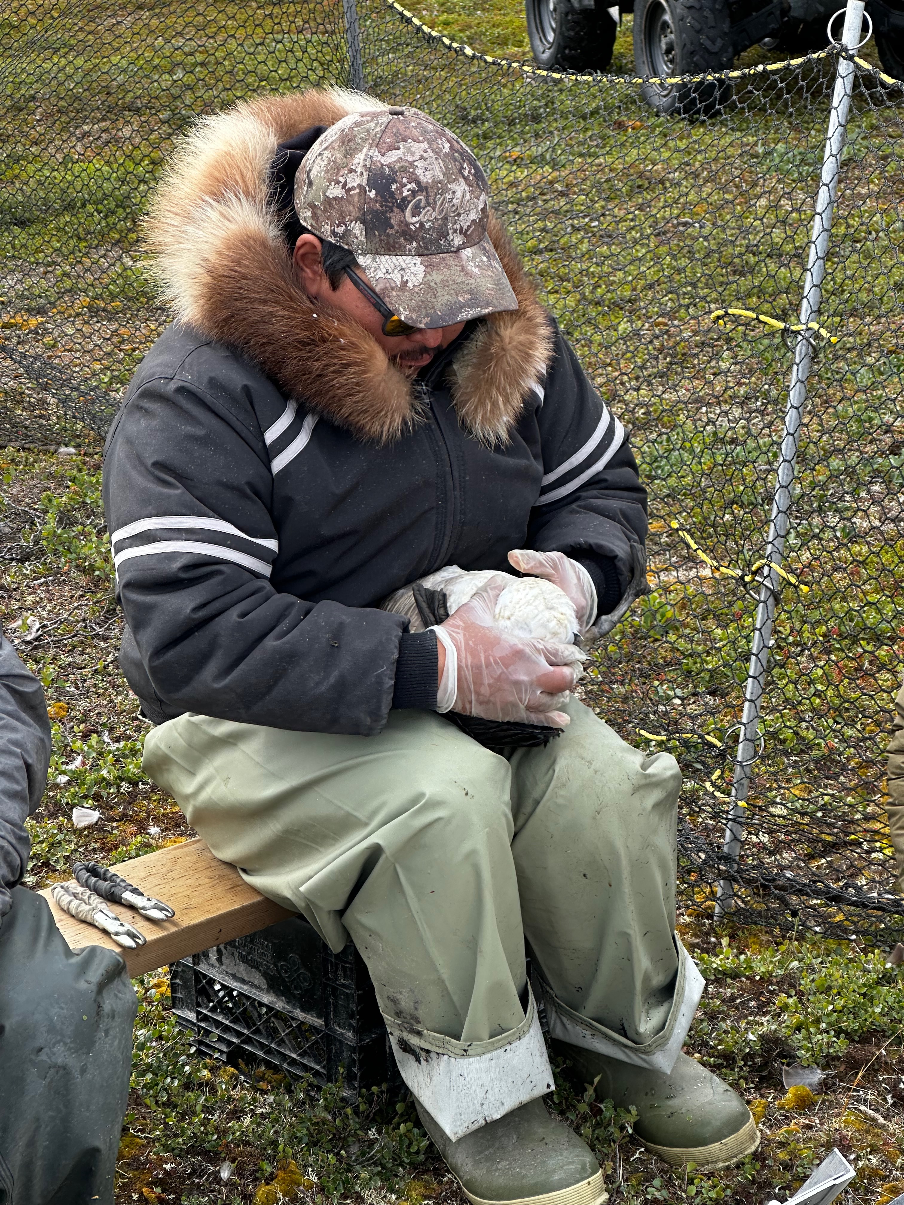 Working closely with Aqqiumavvik staff, Rowan met and discussed with community members to learn about how to identify a sick goose and to document Inuit ways of understanding goose health. Focus groups were held with Elders and hunters, and interviews were conducted with those who have experience hunting, preparing, and eating geese to learn from their experiences. People were eager to share their stories, including memories from an Elder who had participated in some of the first banding efforts in the 1960s. These exchanges were filled with laughter and learning as people remembered and reflected on their past hunting experiences. Through audio recordings of the focus groups and interviews, insights will be shared back with the community through Aqqiumavvik to help encourage more people to hunt and eat geese and to establish a monitoring system based on Inuit knowledge.