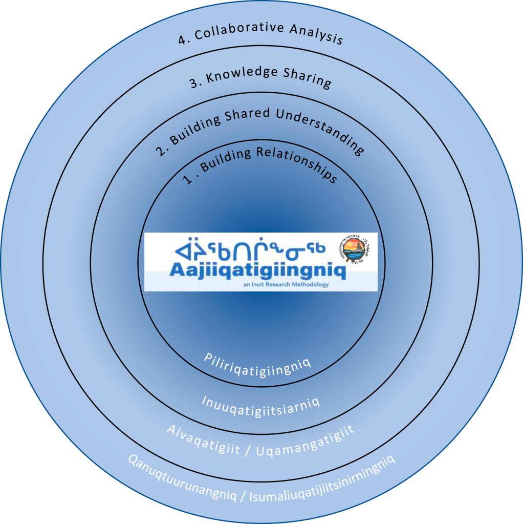 “Aajiiqatigiingniq is an Inuit Qaujimajatuqangit principle used to discuss serious topics and come to consensus around decision-making. In working with Elders on community research issues, the Aqqiumavvik Society in Arviat, Nunavut developed the Aajiiqatigiingniq Research Methodology (ARM) as a participatory and fully inclusive Inuit research approach. We followed the ARM in establishing partnerships, and developing and facilitating a survey, to learn how Nunavut community members use and share available weather, water, ice, and climate information…In this paper, we present the opportunities and challenges of putting the ARM into practice through four research stages: (1) building relationships; (2) building shared understanding; (3) knowledge sharing; and (4) collaborative analysis. In this process, we have come to recognize our strength in connection, Local Research Coordinators as Highly Qualified Personnel, the four Rs of collaborative analysis, and the challenges of hurdling institutions. We share our approach and lessons learned to contribute to ongoing efforts and dialogue around decolonizing research and enhancing Inuit self-determination in research.”
