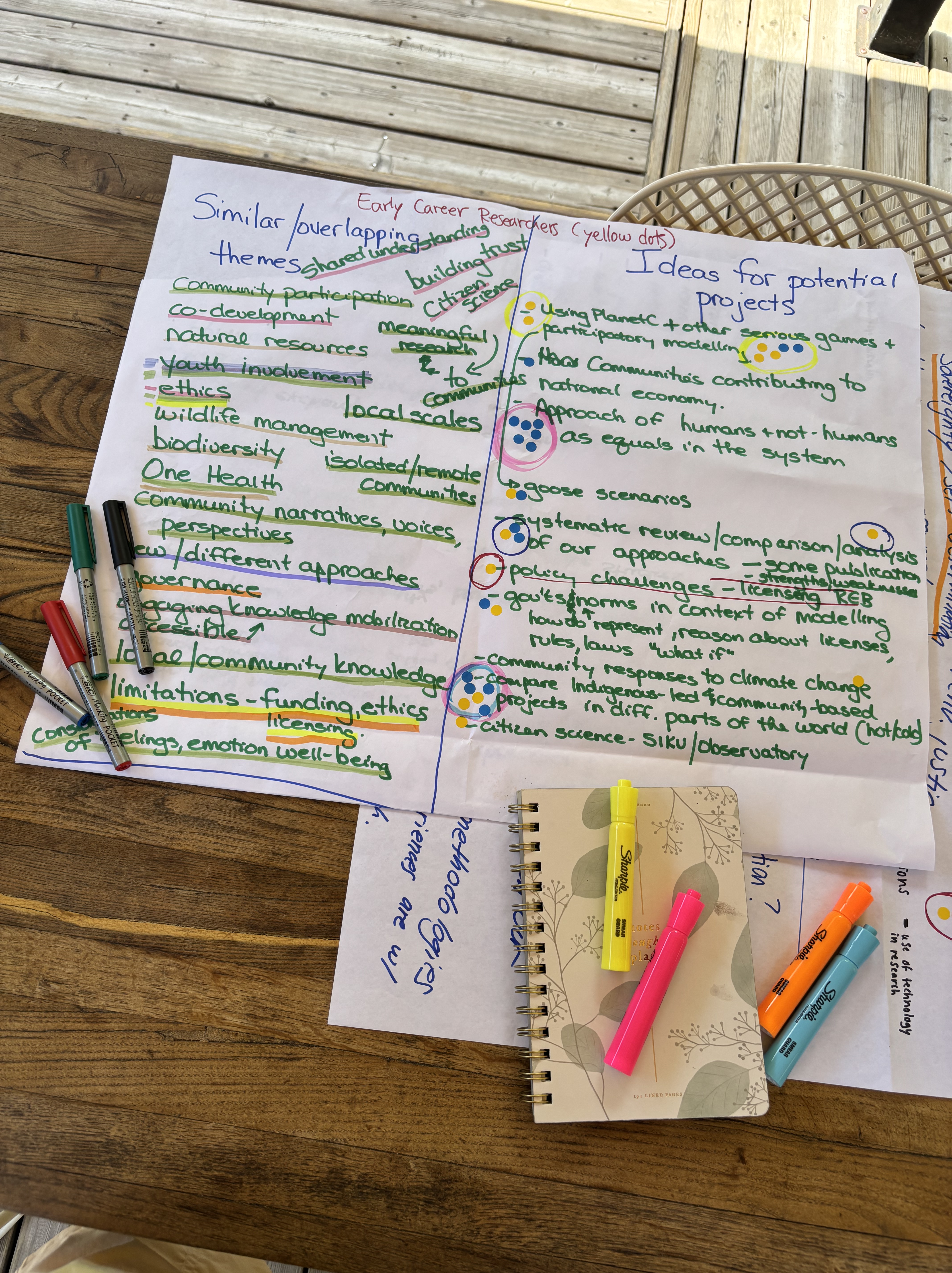 The workshop concluded with reflections on similar/overlapping themes between the two research groups, ideas for potential new projects, and the possible benefits of France-Canada collaboration. To do so, the CIRAD-SUN group split off into two groups: established and early-career researchers. It was interesting to reflect on the similarities and differences between our diverse community-engaged research approaches and to compare interests and project ideas from those at different career stages.