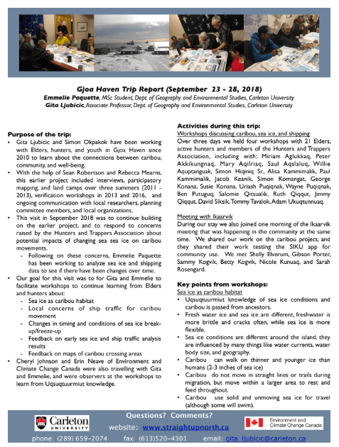 Paquette, E., Ljubicic, G., Johnston, C. A. Okpakok, S., Mueller, D., and Montpetit, B. 2023. Seasonal Sea Ice Conditions Affect Caribou Crossing Areas Around Qikiqtaq, Nunavut: Uqsuqtuurmiut Knowledge Guides Ice Chart Analysis. Arctic, 76(1): 83-101. (https://doi.org/10.14430/arctic77149).