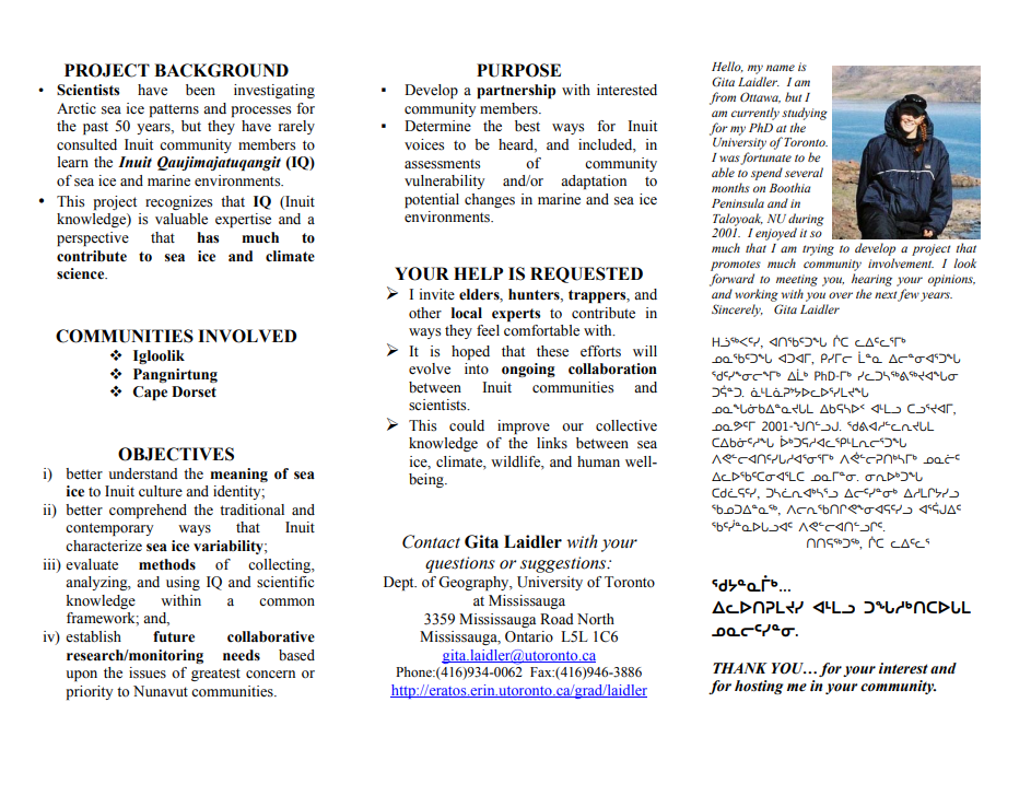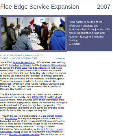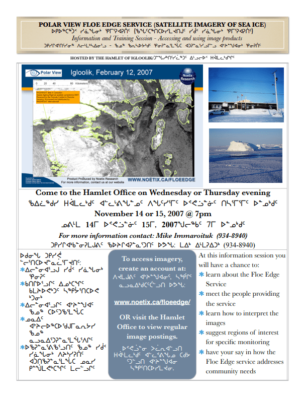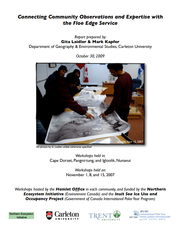 Laidler, G. J., Hirose, T., Kapfer, M., Ikummaq, T., Joamie, E., and Elee, P. 2011. Evaluating the Floe Edge Service: How well can SAR imagery address Inuit community concerns around sea ice change and travel safety? The Canadian Geographer, 55, 1: 91-107. (https://doi.org/10.1111/j.1541-0064.2010.00347.x).