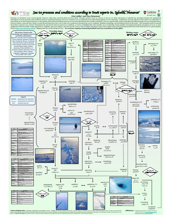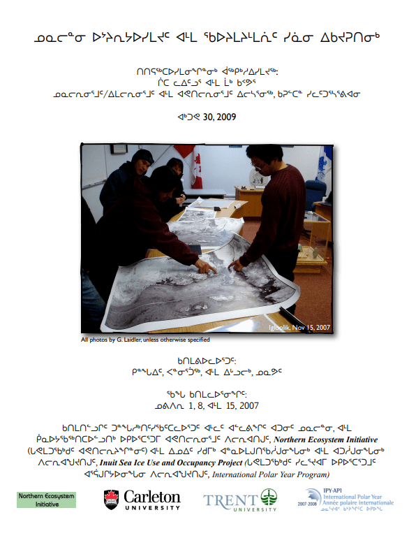 Ljubicic, G. J., Pulsifer, P. L., Hayes, A., and Taylor, D. R. F. 2014. The Creation of the Inuit siku (Sea Ice) Atlas. In: Taylor, D. R.F. and Lauriault, T. P. (eds.). Developments in the Theory and Practice of Cybercartography: Applications and Indigenous Mapping (2nd Edition). Oxford: Elsevier Science. pp. 201-218. (https://doi.org/10.1016/B978-0-444-62713-1.00014-3).