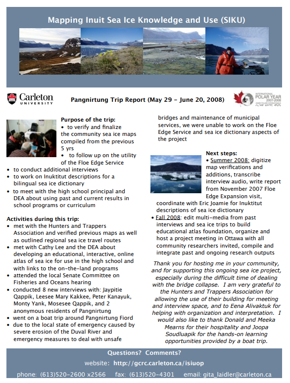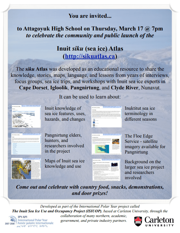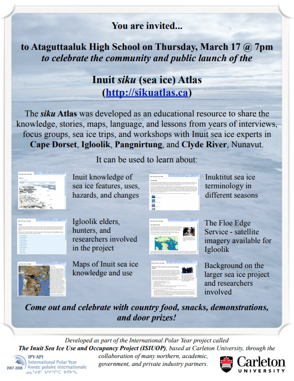Combined, these efforts aim to create new approaches to mapping, where the dynamic nature, use, and importance of seasonal sea ice cover is shown according to Inuit practices and perspectives, based upon their rich local knowledge base and oral history. The Inuit Siku (sea ice) Atlas evolved as one of the ways of sharing (and integrating) important results coming out of our joint efforts within the International Polar Year (2008/2009).