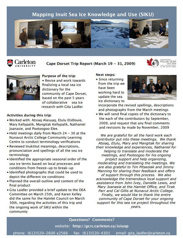 Pulsifer, P. L., Laidler, G. J., Taylor, D. R. F., and Hayes, A. 2010. Creating an Online Cybercartographic Atlas of Inuit Sea Ice Knowledge and Use. In: Krupnik, I., Aporta, C., Gearheard, S., Laidler, G. J., and Kielsen-Holm, L. (eds.). SIKU: Knowing Our Ice, Documenting Inuit Sea-Ice Knowledge and Use. Dordrecht: Springer. 229-254. (https://doi.org/10.1007/978-90-481-8587-0_10)Krupnik, I., Aporta, C., and Laidler, G. J. 2010. Introduction. In: Krupnik, I., Aporta, C., Gearheard, S., Laidler, G. J., and Kielsen-Holm, L. (eds.). SIKU: Knowing Our Ice, Documenting Inuit Sea-Ice Knowledge and Use. Dordrecht: Springer. 1-28. (https://doi.org/10.1007/978-90-481-8587-0_1)