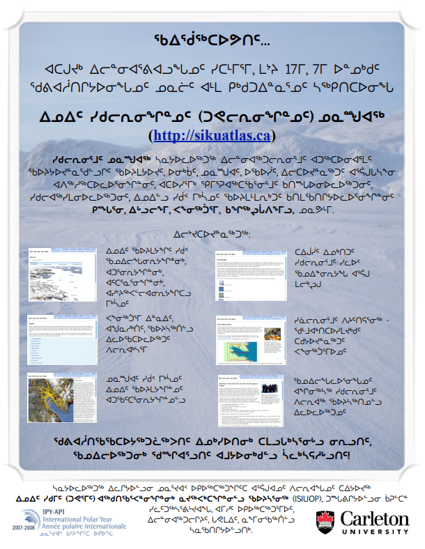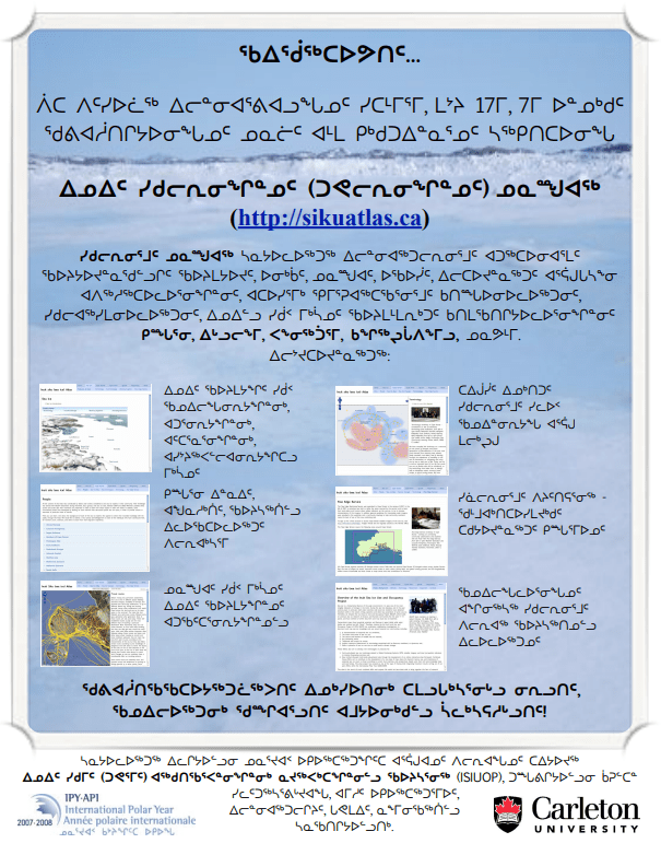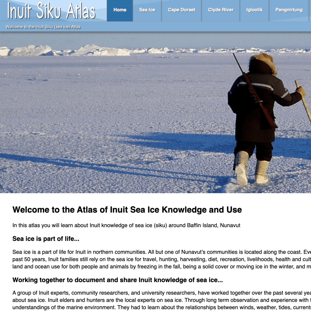 Ljubicic, G. J., Pulsifer, P. L., Hayes, A., and Taylor, D. R. F. 2014. The Creation of the Inuit siku (Sea Ice) Atlas. In: Taylor, D. R. F. and Lauriault, T. P. (eds.). Developments in the Theory and Practice of Cybercartography: Applications and Indigenous Mapping (2nd Edition). Oxford: Elsevier Science. pp. 201-218. (https://doi.org/10.1016/B978-0-444-62713-1.00014-3).