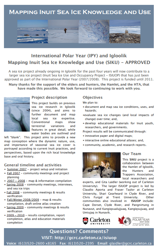 Sea ice is a fundamental feature of the polar environment. It is also one of the most tangible indicators of change in the Arctic. During the last two decades, and in the past several years in particular, both polar scientists and local Inuit residents have detected important shifts in the extent, timing, dynamics and other key parameters of arctic sea ice. Therefore, we initiated the Inuit Sea Ice Use and Occupancy Project (ISIUOP), which builds on previous sea ice research in Nunavut and Nunavik communities (from the SUN Team the Ice Through Inuit Eyes project), and have worked to further document and map local sea ice expertise.