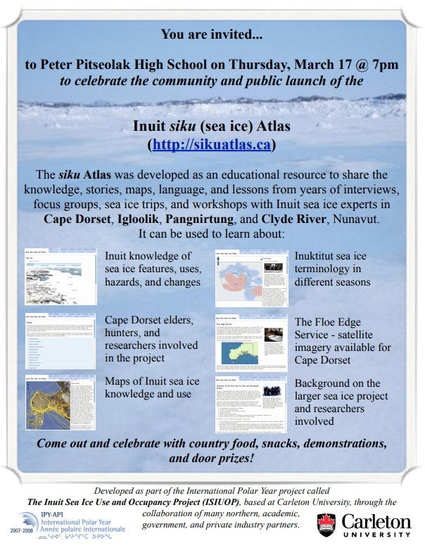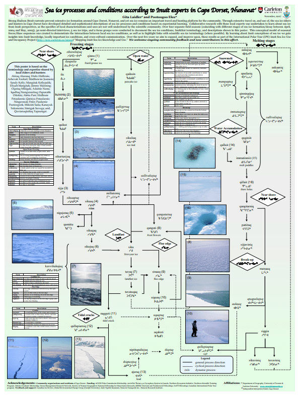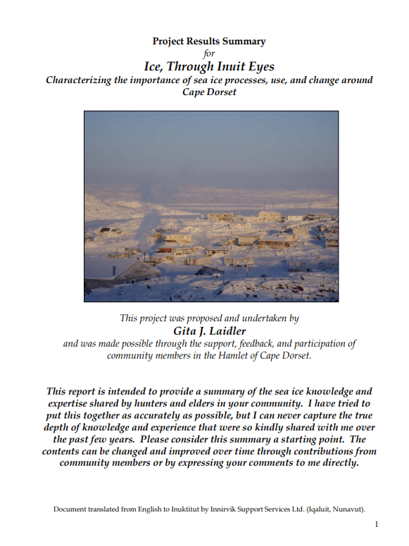 Laidler, G. J. and Elee, P. 2008. Human geographies of sea ice: freeze/thaw processes around Cape Dorset, Nunavut, Canada. Polar Record, 44, 228: 51-76. (https://doi.org/10.1017/S0032247407007061).
