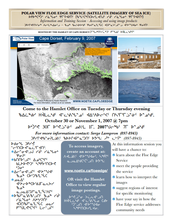 Laidler, G. J., Hirose, T., Kapfer, M., Ikummaq, T., Joamie, E., and Elee, P. 2011. Evaluating the Floe Edge Service: How well can SAR imagery address Inuit community concerns around sea ice change and travel safety? The Canadian Geographer, 55, 1: 91-107. (https://doi.org/10.1111/j.1541-0064.2010.00347.x).