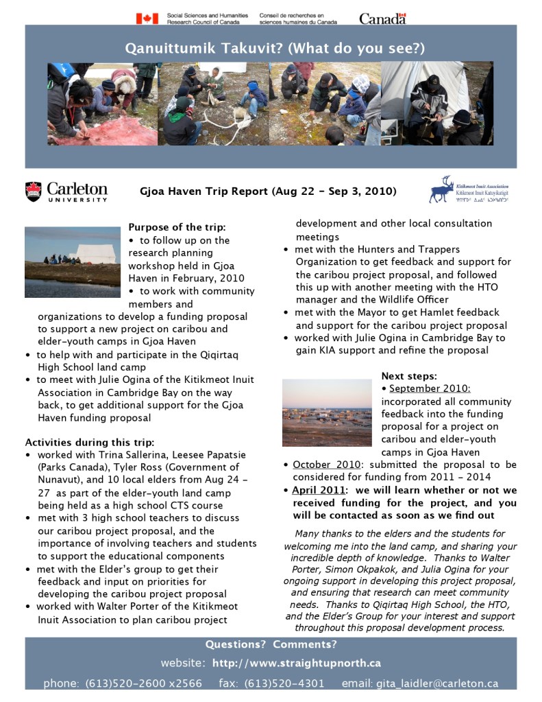 Qanuittumik takuvik? (what do you see?) was commonly asked of Inuit youth by their parents and grandparents. This was a daily encouragement for them to observe and understand early morning weather, and what the day might hold. We use this as both a title and a guiding question in our project, with the goal of understanding some of the complex impacts of social and environmental changes. Our project expanded from previous community-based, collaborative sea ice research in the Qikiqtaaluk (Baffin) Region of Nunavut. At a sea ice and weather forecasting workshop held in Iqaluit in March 2007, we met Elders from the Kivalliq and Kitikmeot regions who encouraged us to consider doing research in their regions to learn about the distinct environmental, cultural, and socio-economic conditions in their home communities (Rankin Inlet and Gjoa Haven).