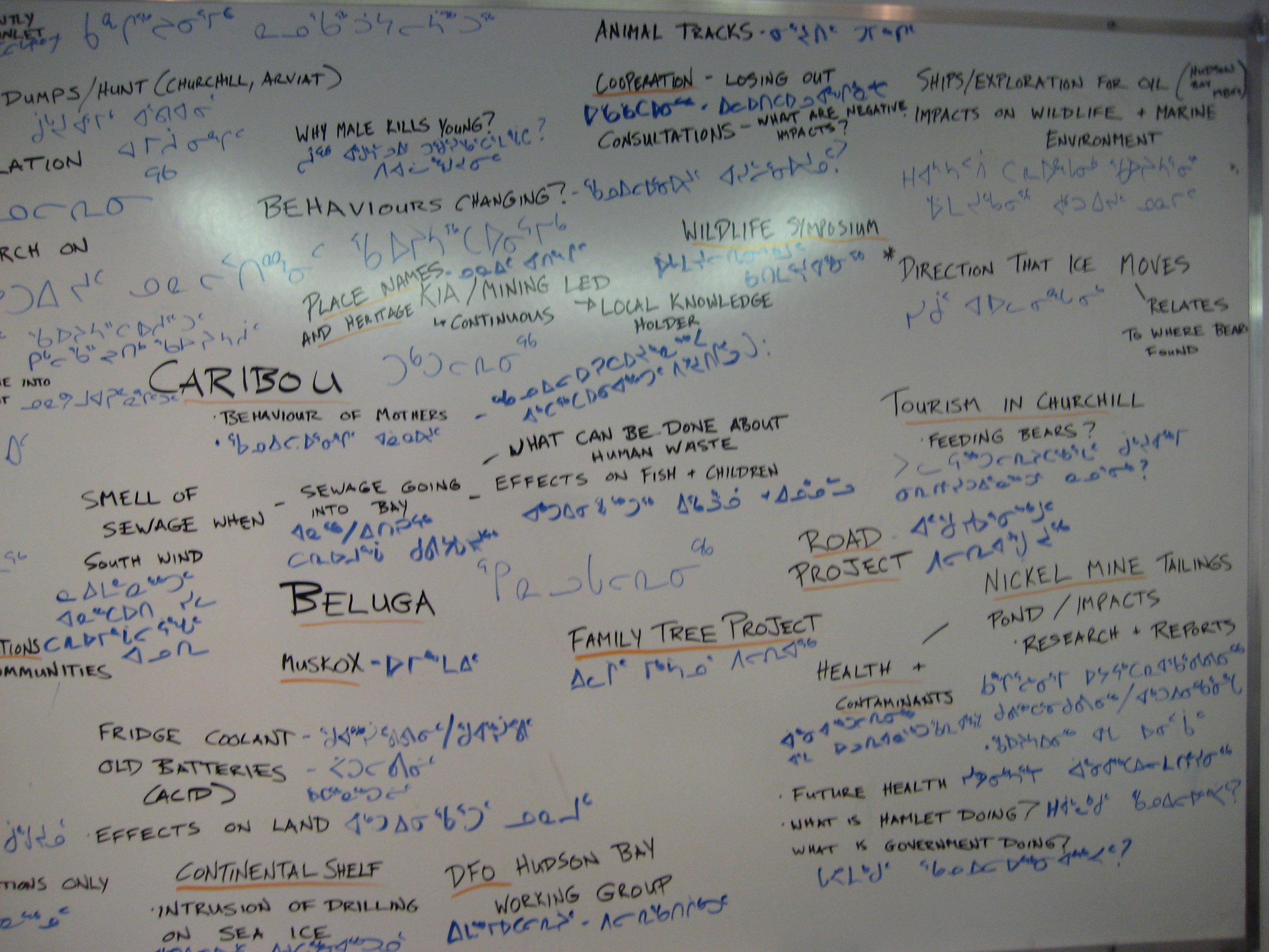 We worked with the Kivalliq and Kitikmeot Inuit Association Community Liaison Officers (Veronica and Walter) to organize follow-up workshops in Rankin Inlet (December 2009) and Gjoa Haven (February 2010). These were exploratory workshops to understand: