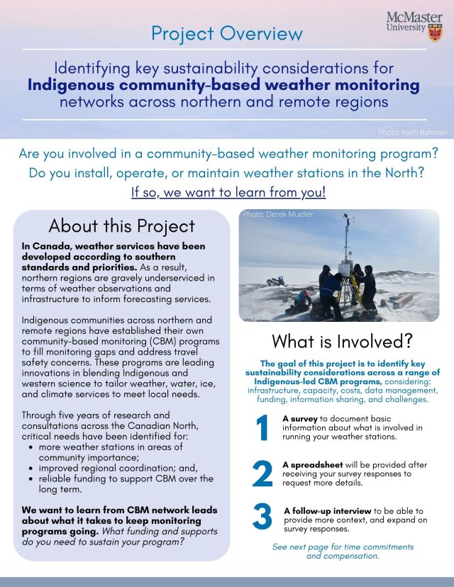 Crown-Indigenous Relations and Northern Affairs Canada (CIRNAC) funds the Indigenous Community-Based Climate Monitoring Program (ICBCMP), supporting Indigenous-led environmental monitoring across the country. In discussions with several ICBCMP leads, we learned there is interest in exploring how a regional approach to Indigenous-led weather service delivery could help to connect community and national weather programs to better address northern priorities.