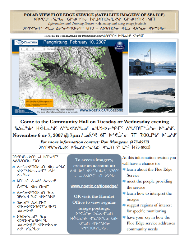 In November 2007 we conducted information sessions and a research workshop in each community to introduce the Floe Edge Service. Through these meetings we were able to gain more understanding and information about northern community priorities in the Qikiqtaaluk (Baffin) region related to weather forecasting and satellite imagery products. The goal of this project is to enhance the user-friendly nature of forecasting products, and to expand Environment Canada’s capacity to deliver region-specific services to improve travel and land/sea ice use and safety for northern community members.
