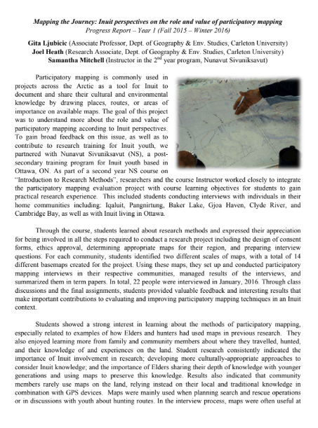NS is a post-secondary training program for Inuit youth based in Ottawa, ON. We worked with Samantha and students of the second year “Introduction to Research Methods” course to introduce participatory mapping methods. In 2015-2016 students also contributed to participatory mapping evaluations as part of a research project they did while they were home for the holidays. It was not feasible to keep the mapping evaluation as part of the NS research course, but Gita and Joel did a guest presentation on participatory mapping at NS each year of the project.