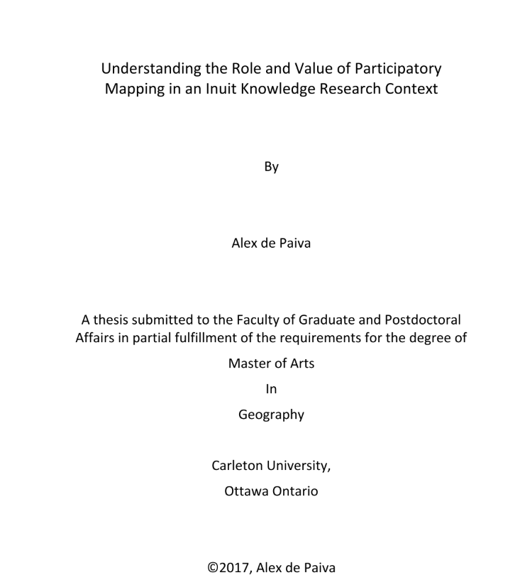 de Paiva, A. [MA thesis, 2017] Understanding the Role and Value of Participatory Mapping in an Inuit Knowledge Research Context. (Carleton University). (https://doi.org/10.22215/etd/2018-12620)