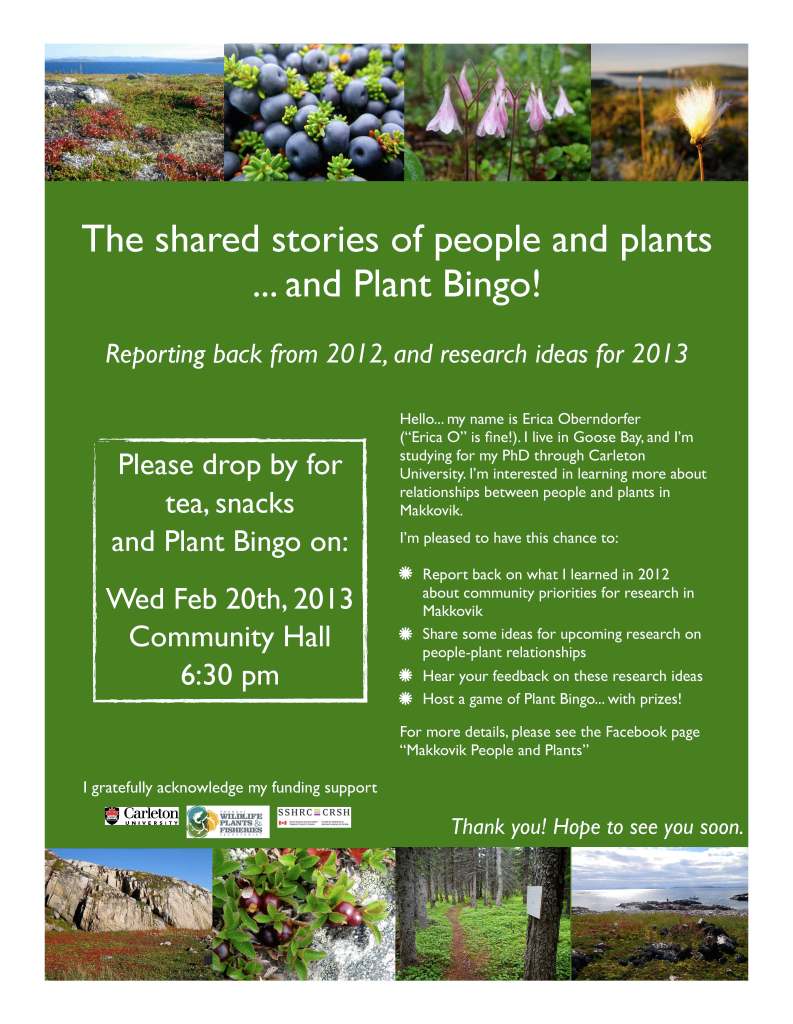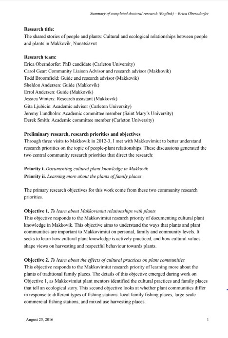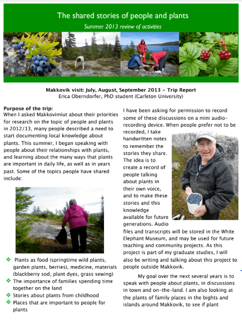 Oberndorfer, E. [PhD thesis, 2016] The shared stories of people and plants: Cultural and ecological relationships between people and plants in Makkovik, Nunatsiavut (Labrador, Canada). (Carleton University). (https://doi.org/10.22215/etd/2016-11681)