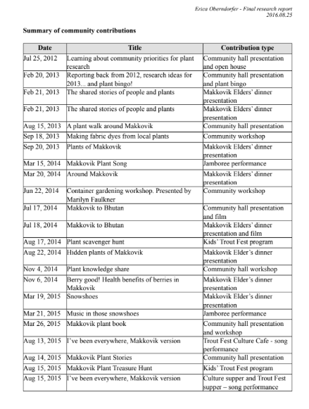 Through three preliminary visits to Makkovik in 2012-2013, Erica met with Makkovimiut to better understand research priorities on the topic of people-plant relationships. These discussions generated the two central community research priorities that directed the research: