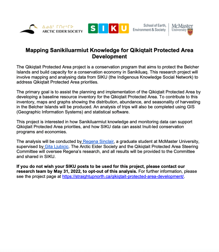 If you are posting on SIKU to the Qikiqtait Project please review this information about how your data is being used.