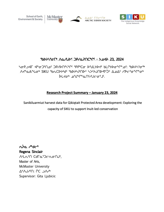 Sinclair, R. [MA thesis, 2024] Sanikiluarmiut harvest data for Qikiqtait Protected Area development: Exploring the capacity of SIKU to support Inuit-led conservation. (McMaster University).