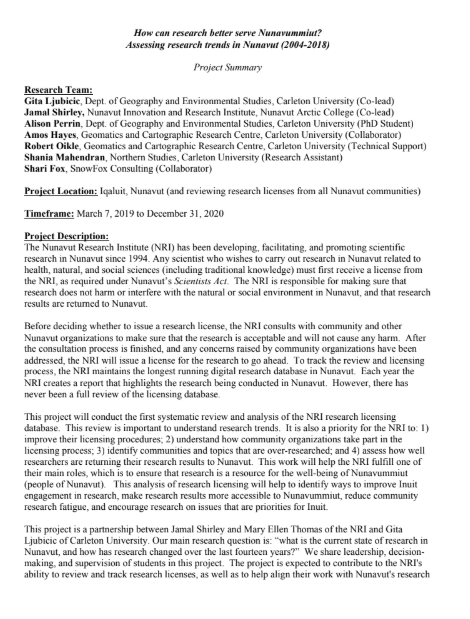 To manage research license applications and reporting, the NRI maintains the longest running digital research database in Nunavut. This project will undertake the first ever systematic review and analysis of the NRI research licensing database. We want to understand the current state of research in Nunavut, and how research has changed over time. We will use the research license database to learn about who is doing research, on what issues, and where. We also want to identify which communities or topics are over-researched, or other areas that are overlooked.