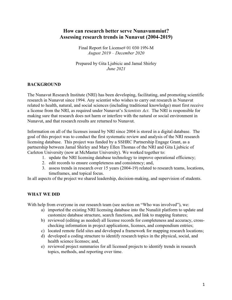 Polidoro, A., Carter, N., Ljubicic, G., Perrin, A., and Shirley, J. 2024. What is happening where? An evaluation of social sciences research trends in Nunavut (2004-2019). FACETS, 9: 1-20. (https://doi.org/10.1139/facets-2023-0087).