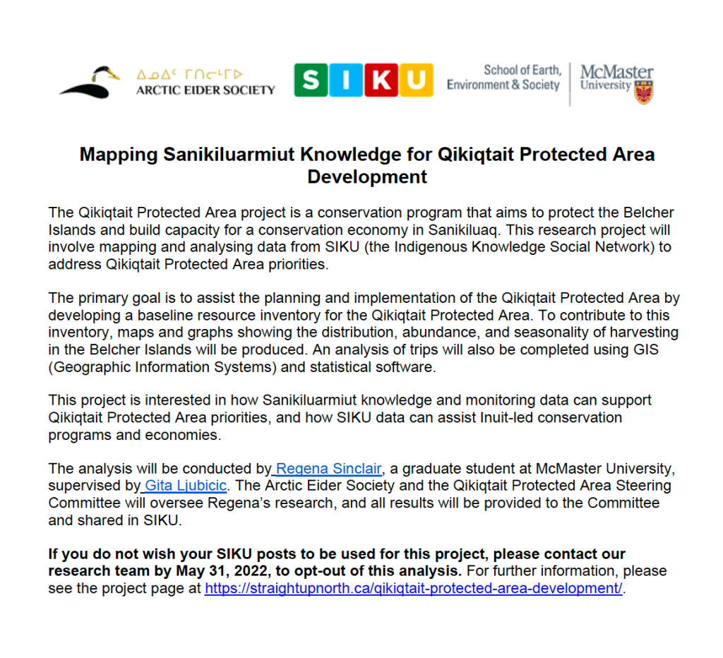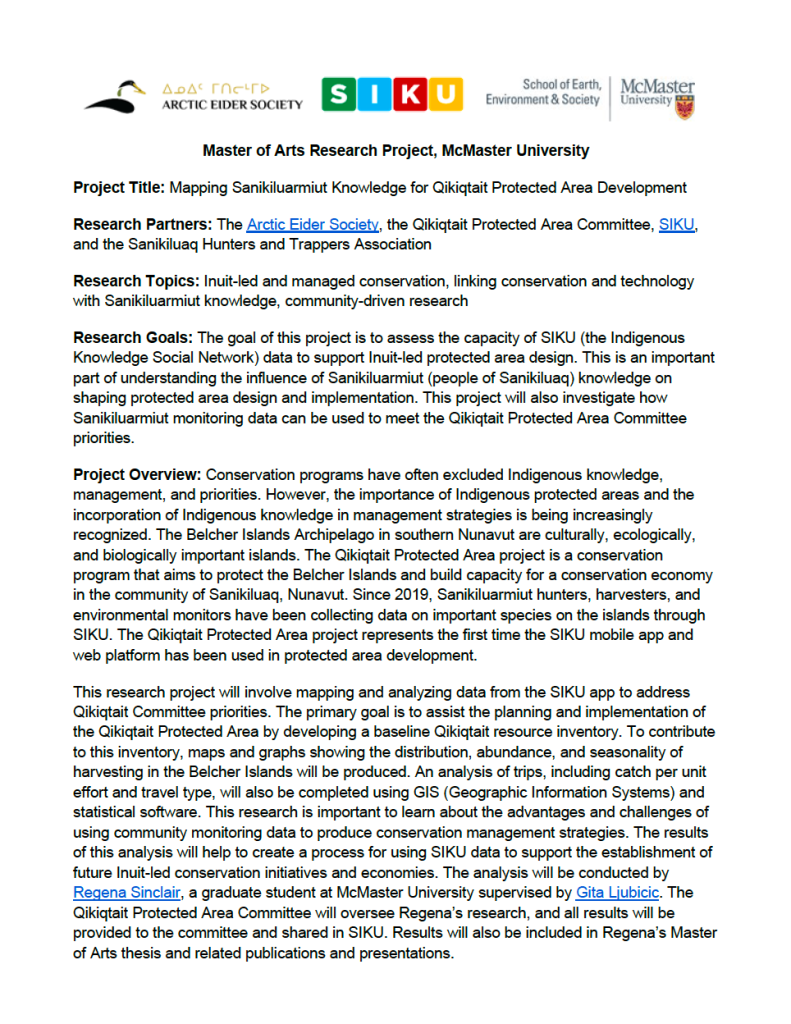 Sinclair, R. [MA thesis, 2024] Sanikiluarmiut harvest data for Qikiqtait Protected Area development: Exploring the capacity of SIKU to support Inuit-led conservation. (McMaster University).