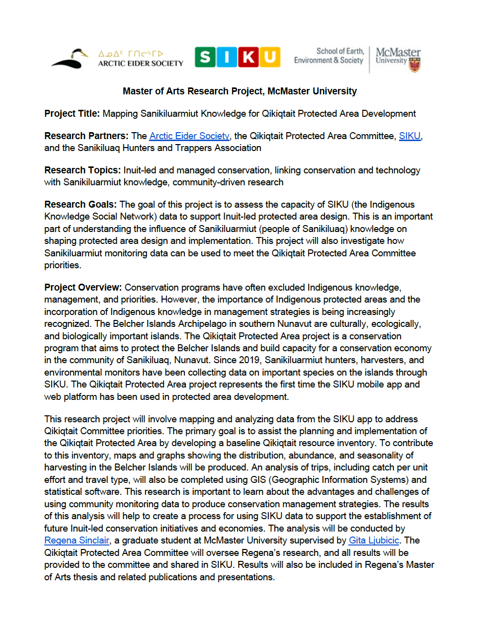 Sinclair, R. [MA thesis, 2024] Sanikiluarmiut harvest data for Qikiqtait Protected Area development: Exploring the capacity of SIKU to support Inuit-led conservation. (McMaster University).