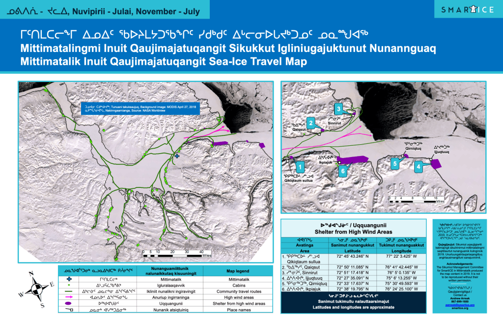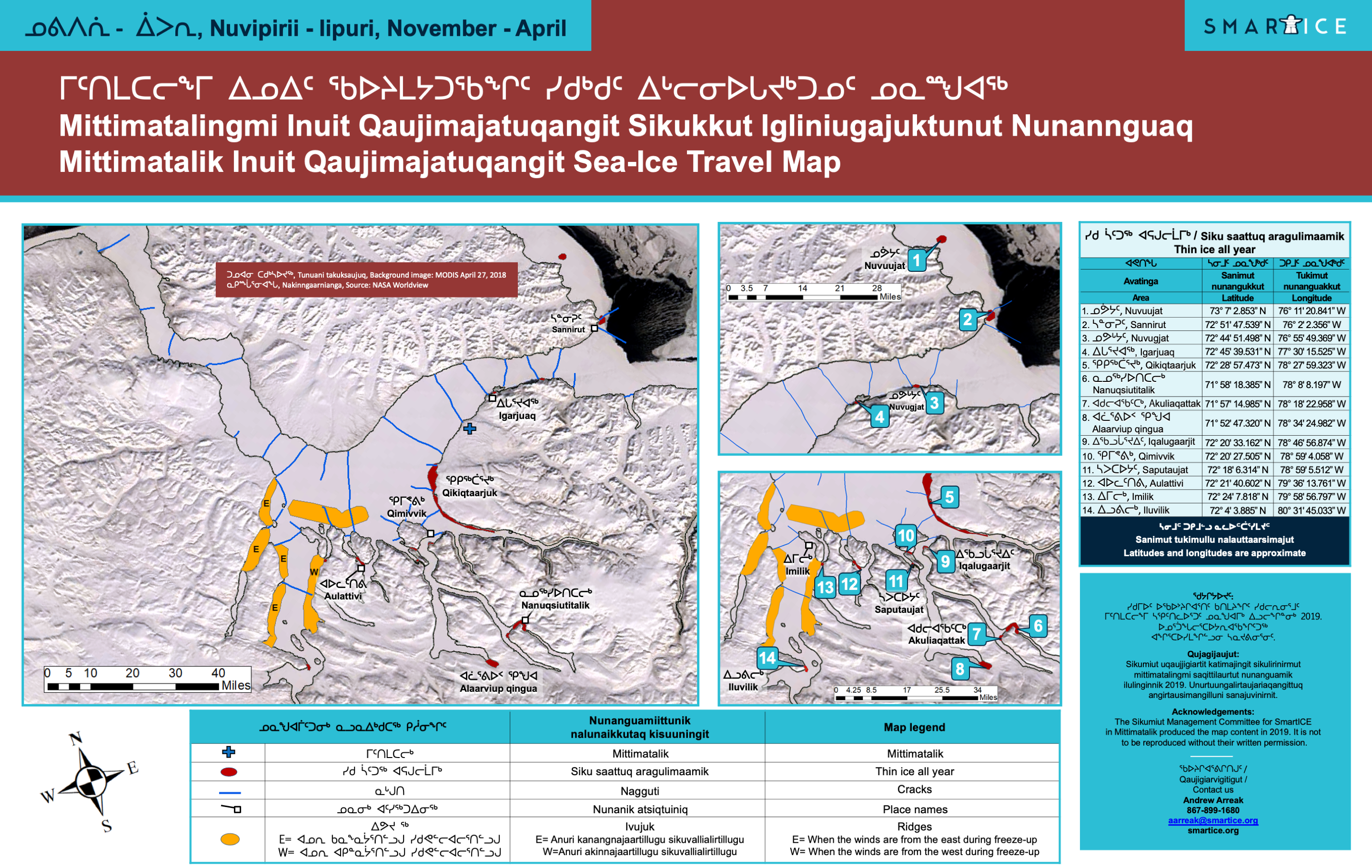 - Three seasonal travel safety maps that highlight known areas of safe shelter and locations of dangerous sea ice conditions as the seasons change, with relevant geographic coordinates for input into personal GPS devices. In May of 2020, Sikumiut posters and maps were displayed in public spaces in the community and on the Mittimatalik SmartICE Facebook site.